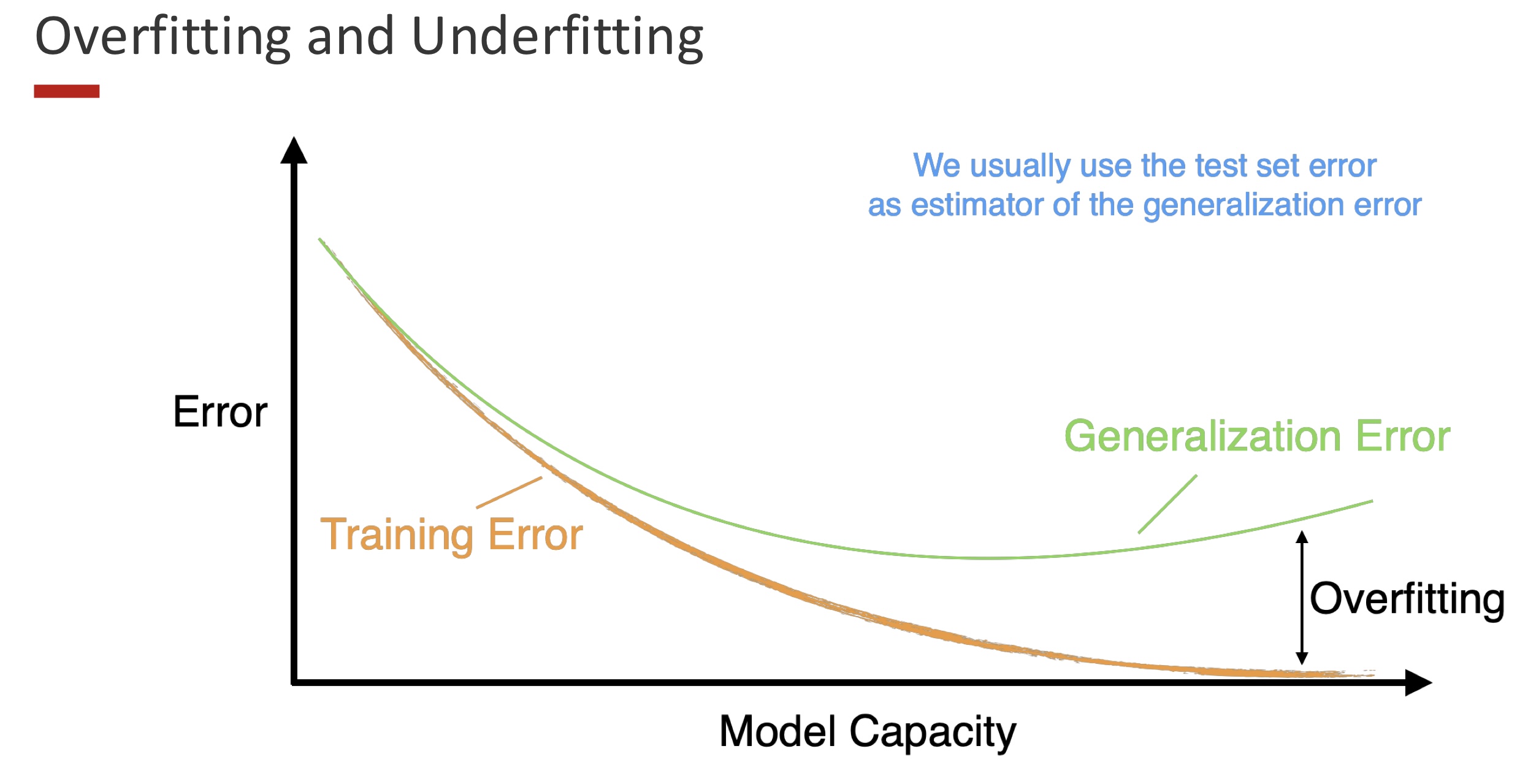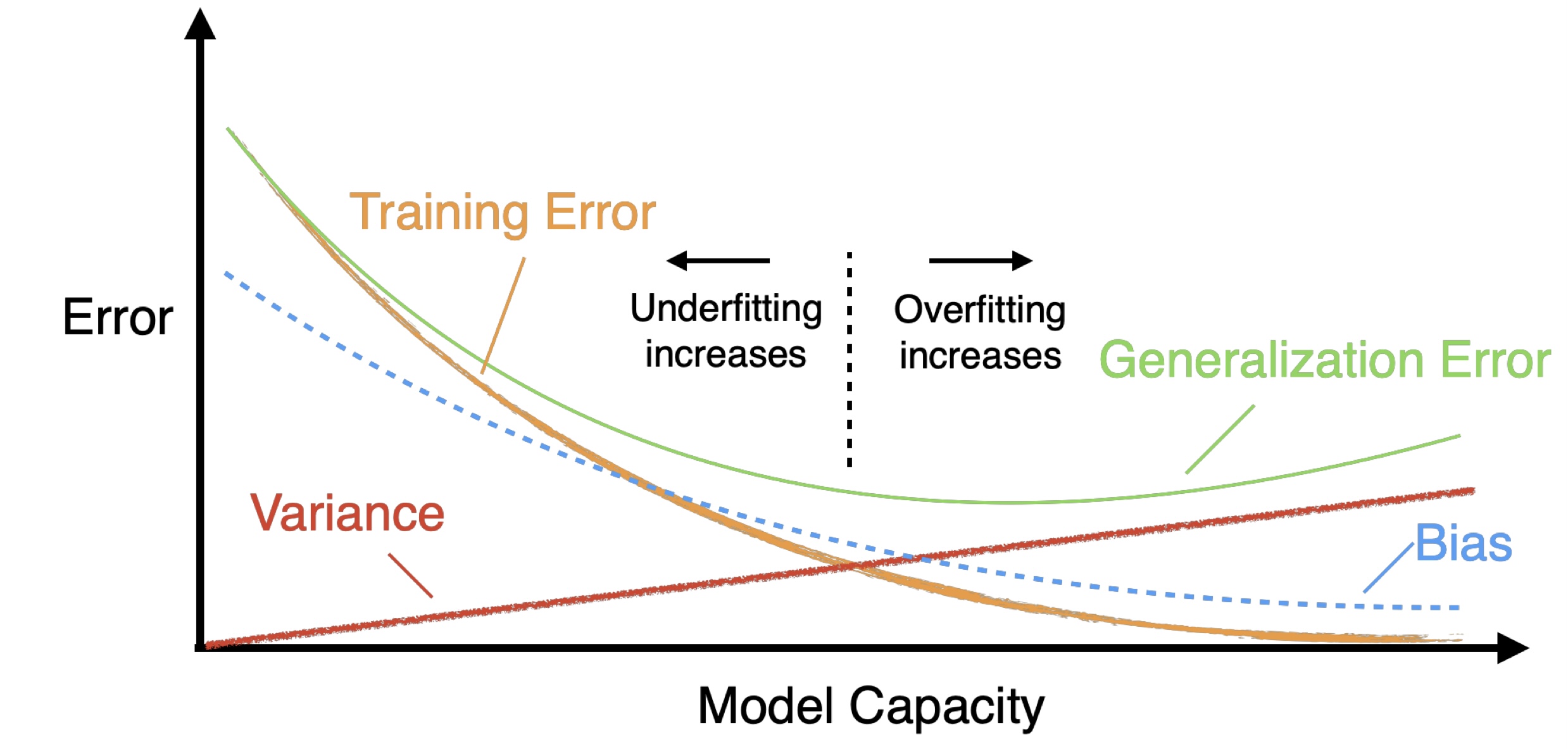 - Generalization (test/validation) error (green) first decreases (model fits signal better), then increases when the model starts to fit noise → overfitting.