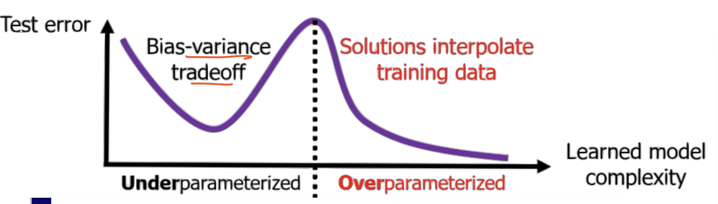 - Deep learning (modern practice): typically the second descent (massively overparameterized) is better when there is enough data, SGD’s implicit bias, and good architectures/regularization. That’s why today larger models often generalize better.