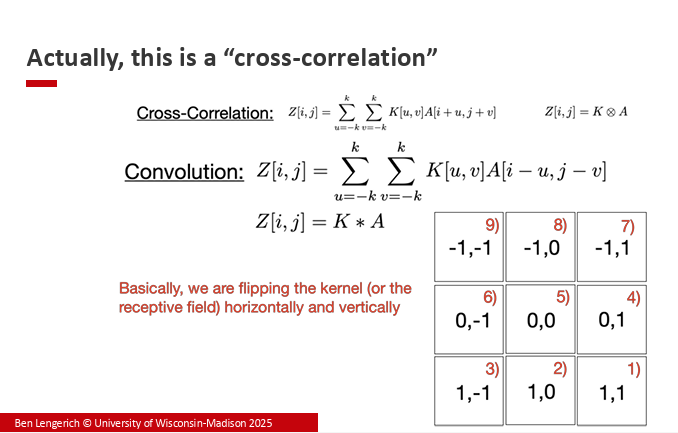 Cross-correlation: \(Z[i,j] = \sum_{u=-k}^k \sum_{v=-k}^k K[u,v] \, A[i+u, j+v]\)
