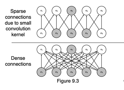 - Sparse connections also enforce the idea that local patterns (e.g., edges, corners) are important for building up more complex representations.