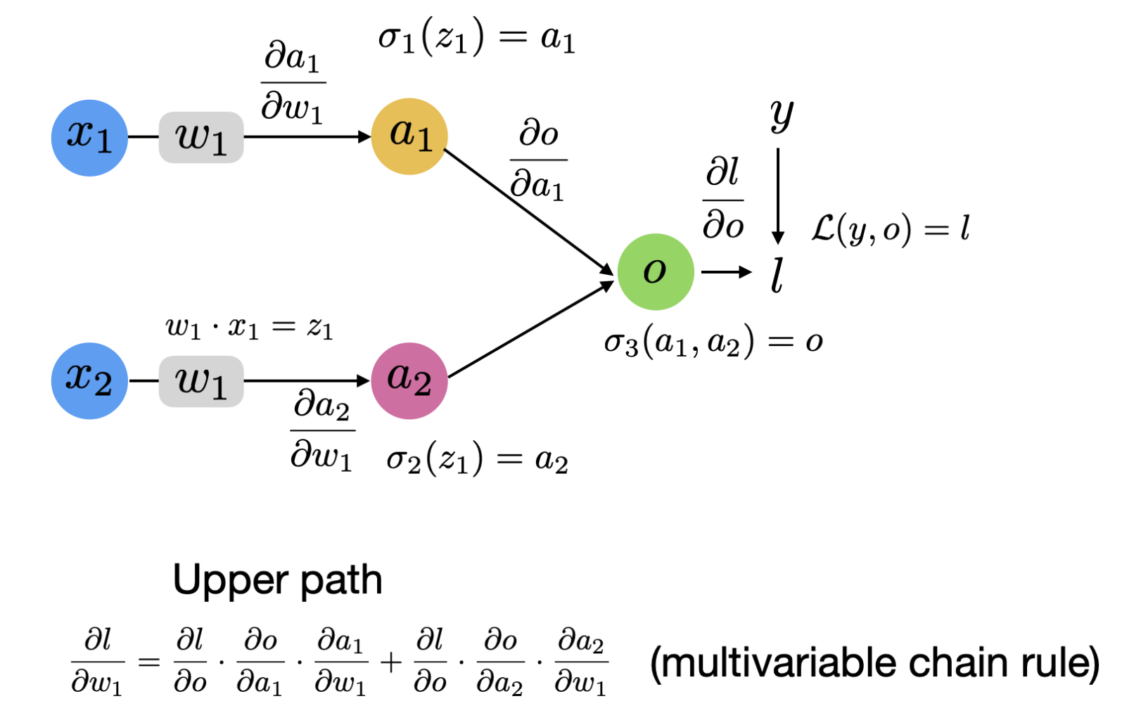 - In the computation graph, x: input. w: kernel weights. a: activation output. o: fully connected layer output. l: loss function.