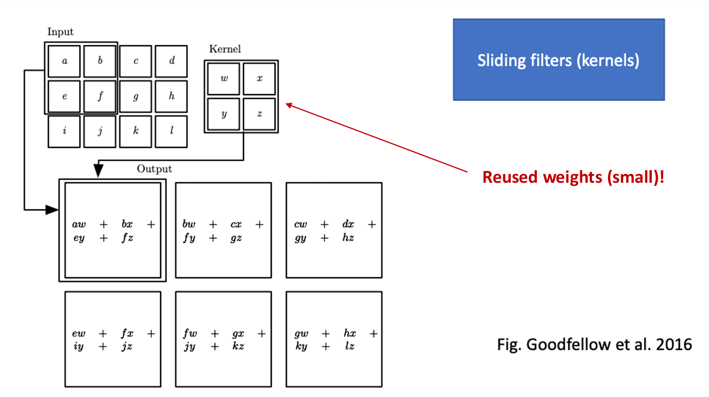 - The same weights (a kernel/filter) are reused for different patches of the input.