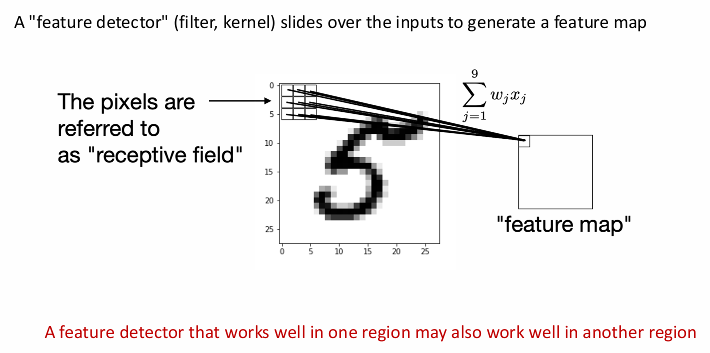 - Calculation: Each value in the “feature map” is computed as a weighted sum (dot product) of the kernel’s weights ($w_i$) and the pixel values ($x_i$) within its receptive field: $\sum w_i x_i$.