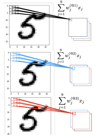 Concept: A “feature detector” (the filter or kernel) slides over the input image (like the “5”) to generate a “feature map”.